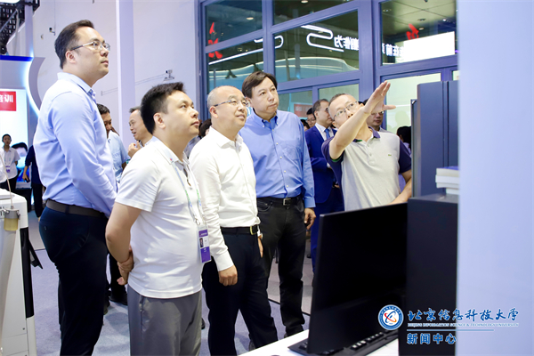 第26届中国北京国际科技产业博览会于日前隆重开幕。7月14日,北京市委常委、教育工委书记于英杰率队参观博览会,并驻足我校展位察看指导学校电子信息、人工智能领域科技创新成果。市贸促会党组书记、主任郭怀刚、市委教育工委办公室主任刘忠心陪同参观。校党委副书记、校长郭福热情接待于英杰一行并介绍参展成果和展位整体情况。