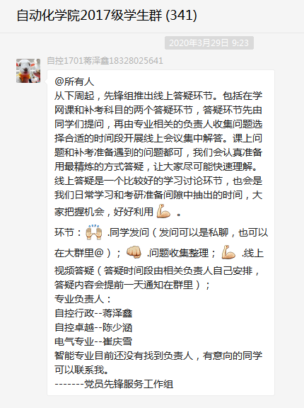 当前,疫情尚未结束,自动化学院学生党员先锋服务工作组还将继续为同学们服务,以实际行动发挥党员的先锋模范作用,为大家强化居家学习成效加油助力。