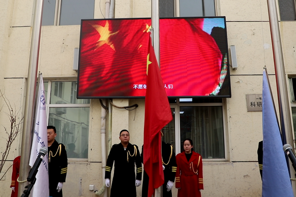 由王懿、李坤阳等7位硕士研究生组成的护旗队迈着统一步伐护旗行至升旗台,伴随着雄壮的国歌声,五星红旗冉冉升起,迎风飘扬,全场师生庄严肃立,向国旗行注目礼,齐唱国歌,深切表达对祖国的无限热爱和崇高敬意。