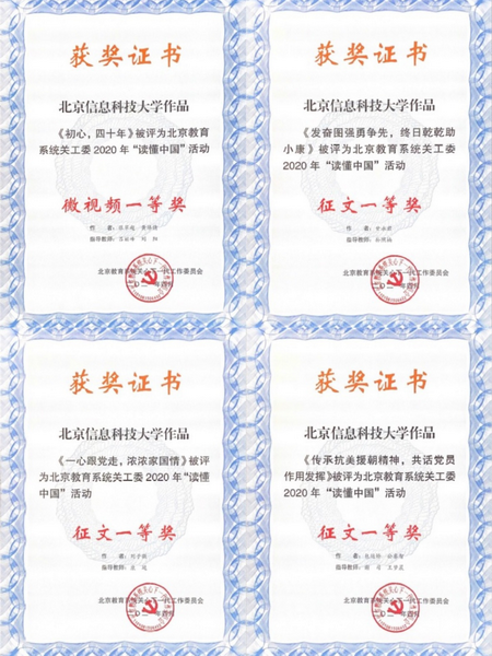 校关工委获评北京教育系统2020年“读懂中国”活动优秀组织奖;学校选送的2个微视频、7篇征文分获微视频、征文奖项。其中,公管传媒学院作品获微视频一等奖,校团委作品获微视频三等奖;自动化学院、通信学院、理学院作品获征文一等奖,光电学院、计算机学院、公管传媒学院作品获征文二等奖。