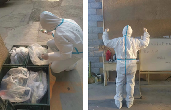 国贸1801班胡珺山所居住的房山区窦店镇一村属于高风险地区,面对如此严峻的形势,胡珺山快速果断报名社区志愿者工作,协助完成严格筛查进出人员,挨家挨户给小区居民上门收垃圾、送快递等工作。