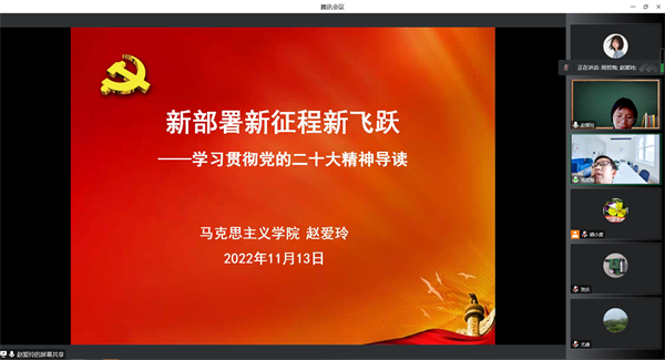 11月13日,马克思主义学院院长、学院“党的二十大精神宣讲团”团长赵爱玲教授为仪器科学与光电工程学院全体教师线上宣讲党的二十大精神。光电学院与马克思主义学院近百位教师参加宣讲活动。宣讲由光电学院党委书记周哲海主持。