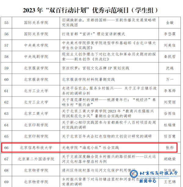 近日,2023年北京高校师生服务新时代首都发展“双百行动计划”优秀示范项目名单公布,我校光电学院“海底小纵”社会实践项目荣获2023年“双百行动计划”优秀示范项目(学生组)。