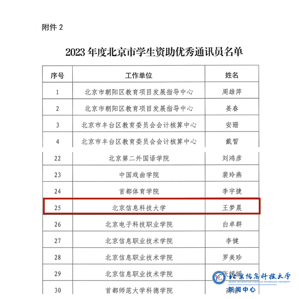 近日,北京市教育资产与财务管理事务中心组织开展了2023年度北京市学生资助优秀宣传工作单位和优秀通讯员的评选工作。我校获得“2023年度北京市学生资助优秀宣传工作单位”荣誉称号,党委学工部王梦晨老师荣获“2023年度北京市学生资助优秀通讯员”荣誉称号。