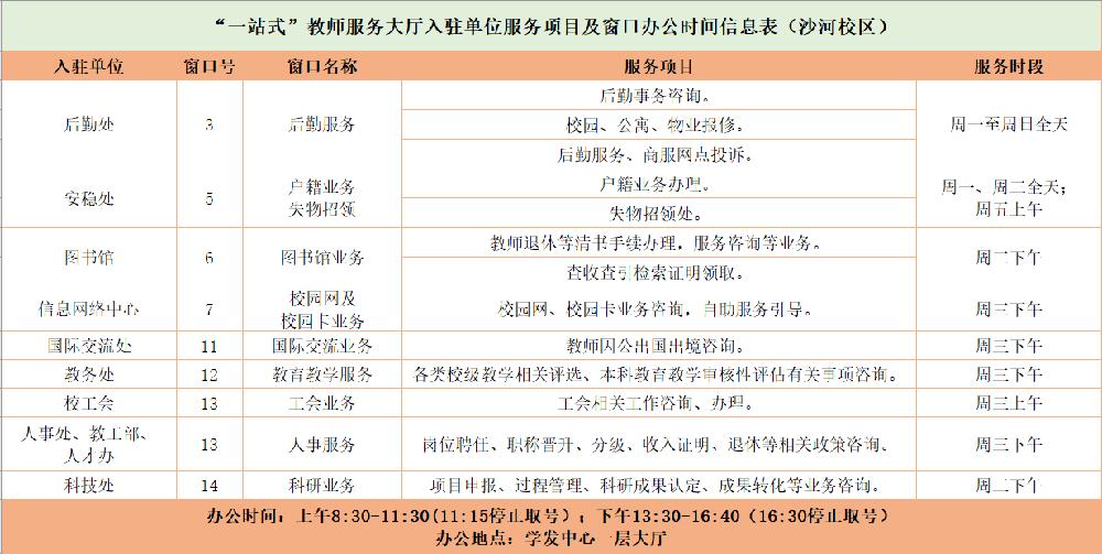 “一站式”教师服务大厅入驻单位服务项目及窗口办公时间信息表(沙河校区)