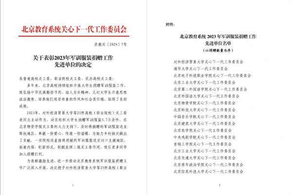 学校关工委积极响应北京教育系统关工委号召,与学工部(武装部)、各学院关工委共同组织动员军训学生捐赠军训服装1416件,被授予“北京教育系统2023年军训服装捐赠工作先进单位”荣誉称号。